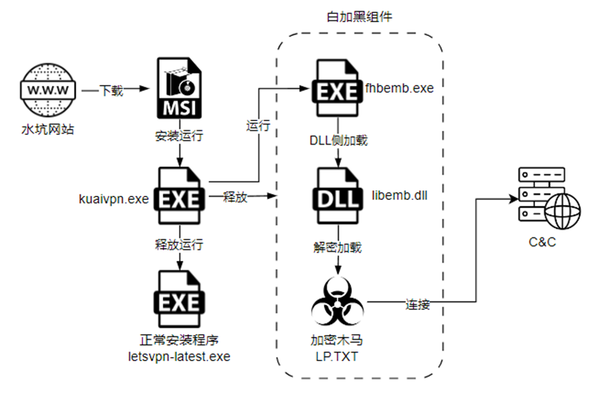 不法分子通过将木马病毒与快连 VPN 安装包二次打包(生成“套壳快连 VPN”),通过某种框架修改快连 VPN 的原始文件,直接植入病毒(生成“破解版快连 VPN”)。这些恶意版本表面上与正版无异,但会在安装后悄无声息地植入木马程序,窃取用户信息。